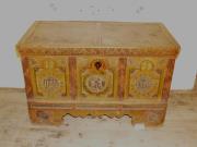 Abstract: Die Truhe besteht aus Holz und hat eine rechteckige Form. Die Truhe wird von vier Füßen getragen. Auf der Vorderseite befinden sich mehrere Malereien; auf den beiden Außenseiten sind ein Jesus- und ein Joseph-Monogramm angebracht. In der Mitte ist ein Maria-Monogramm gemalt. Zudem wurde die Zahl 18 und 55 hinaufgeschrieben und steht wohl für das Entstehungsjahr der Truhe 1855.
