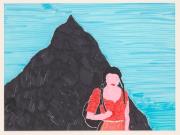 Abstract: Halbfiguriges Mädchen mit schwarzen Zöpfen und Rucksack im roten Kleid steht vor schwarzem Berggipfel und blauem Himmel.