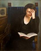 Abstract: Das Werk stellt die Frontalansicht einer lesenden jungen Frau dar. Sie befindet sich in einen Raum und links von der Stuhllehne steht ein kleines Porträt. Im Bild rechts unten befinden sich die Initialen der Künstlerin.