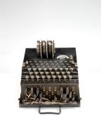 Abstract: Elektrisch-mechanische Schlüsselmaschine Enigma Modell I; ohne Abdeckung Eigenschaften: Walzensatz mit drei Rotoren, Lampenfeld (dreireihig, 26 Stück), Steckerbrett, Tastatur (universal, dreireihig, 26 Großbuchstaben), 4.5 Volt Batterie, Prinzip der polyalphabetischen Substitution Konstrukteur: Arthur Scherbius - Seriennummer 11581