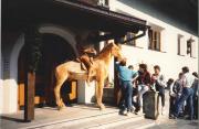 Abstract: Fotografie, Farbe, Querformat. Inhalt: Gruppe von Männern, im Vordergrund in der Mitte ein Holzpferd mit Reiter vor einem Eingang. Rückseite beschrieben: "Schnitzschule St. Jakob" und Fotostempel.
