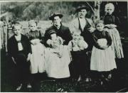 Abstract: Fotografie, schwarz-weiß, Querformat. Inhalt: Familie mit einem Mann und einer Frau, umgeben von zwei Jungen und drei Mädchen, und einem Kleinkind auf dem Schoß der Frau (sechs Kinder). Rückseite beschrieben: "Niederkerschmair Familie. Eltern mit Kindern. v.l.n.rechts: Josef Steger, Niederkerschmair (beim Militär nervenkrank geworden und bereits verstorben (in Nervenklinik)). Anna Steger-Enz, Niederhollenzerin. Johann Steger, im 2. Weltkrieg gefallen. Agnes Steger-Künig, spätere Niederleiterin. Maria Steger-Steger, Gasserin in St. Peter. Der Vater war ein bekannter Sänger."