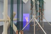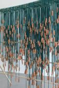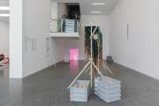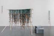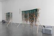 Abstract: Installazione composta da: 2 strutture in legno, 1 scala a pioli in legno, 1 rastrello in legno, impronte di argilla fissate su corde, un totale di 14 contenitori con impronte in argilla sciolte ed il video muto a colori "Collective effort, Squize" (ed. 1/3) che può essere proiettato anche separatamente dall'installazione.