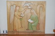 Abstract: Quadro in rilievo scolpito in legno e parzialmente dipinto: Maria, seduta, leggendo in un libro, incontra l'Arcangelo Gabriele con un giglio bianco in mano. Sopra di esso lo Spirito Santo come una colomba bianca.