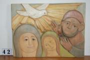 Abstract: Quadro in rilievo in legno intagliato e parzialmente dipinto: raffigurazione di una piccola famiglia con due colombe della pace.