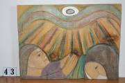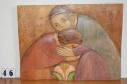 Abstract: Quadro in rilievo scolpito in legno e parzialmente dipinto: raffigurazione di due figure inginocchiate che si abbracciano.