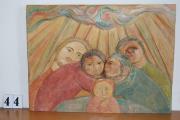 Abstract: Quadro in rilievo in legno intagliato e parzialmente dipinto: raffigurante una famiglia sotto un cielo luminoso.