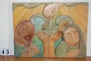 Abstract: Quadro in rilievo scolpito in legno e parzialmente dipinto: raffigurazione della mano divina che regge un contenitore con acqua e grano. Due mani dal basso che raccolgono l'acqua e il grano. Due figure a sinistra e a destra.