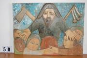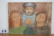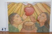 Abstract: Quadro in rilievo scolpito in legno e parzialmente dipinto: rappresentazione di tre figure che reggono un cuore come simbolo dell'amore di Gesù e lo guardano.