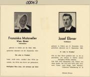 Abstract: Sterbebild von Franziska Matzneller Wwe. Ebner, Tollnmutter Geb. am 28.03.1886 in Aldein, gest. am 20.09.1970 in Aldein mit Foto Sterbebild von Josef Ebner, Tollnbauer Geb. am 16.12.1910 in Aldein, gest. am 02.09.1966 in Aldein mit Foto