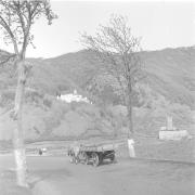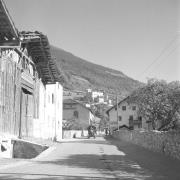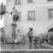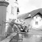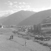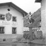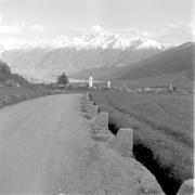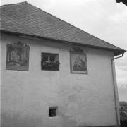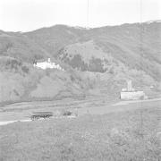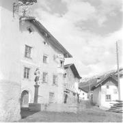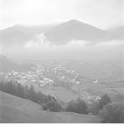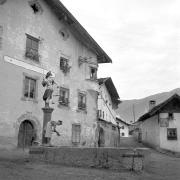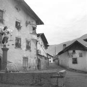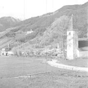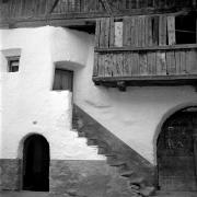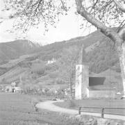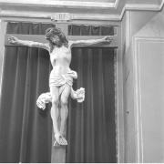 Abstract: Spätgotisches Holzkruzifix in Lebensgröße rechts vom Chor in der Brunecker Pfarrkirche zu Unserer Lieben Frau, im Jahr 1954 aufgenommen. Es zeichnet sich durch den starken Ausdruck des leicht geneigten Hauptes, freie Haarbehandlung, sorgfältige anatomische Durchbildung mit ausgeprägtem Aderlauf an Händen und Füßen und lebhafte Bewegung des zerknitterten Lendentuches aus.