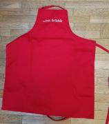 Abstract: 1 Schürze, rot, Baumwolle / Polyester, mit weißem aufgenähtem Werbespruch "Innovating special nutrition. Dr. Schär" (Dr. Schär Ag stellt glutenfreie Nahrungsmittel her). Hersteller: Mapetz.