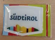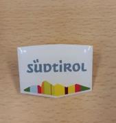 Abstract: 1 Anstecker, rechteckig, weicher Kunststoff, Aufschrift "Südtirol" und Südtirol-Logo (Dachmarke) auf weißem Hintergrund.