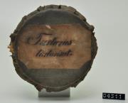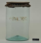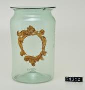 Abstract: Hellgrünes, rundes Bindeglas mit leicht hochgestochenem Boden und Papiertektur. Enthielt Tartarus vitriolatus = Kaliumsulfat: K2SO4 Signiert mit Goldbuchstaben.