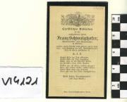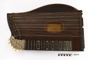 Konzertzither: Amberger, Max, München, 1891 Aus der Werkstatt Heinrich Max Amberger (1863-1910), Geschäftsinhaber seit 1887. Reparatur: Curt Claus Voigt. Korpus mit Ausbauchung auf der vom Spieler abgewandten Seite, einspänige Randeinlage am Deckenrand und Schallloch, zweispänige Randeinlage am Zargenrand, 1 rundes Schallloch; am Boden 3 kugelartige Stützfüße aus Elfenbein mit Metallspitzen Griffbrett auf der Decke aufgeleimt, schwarz politiert, 29 Bünde in vollchromatischer Anordnung, je 2 Perlmuttpunkte als Positionsmarkierung vor dem 5., 9. und 12. Bund, sowie 1 Punkt vor dem 17. Bund, 5 Melodiesaiten + 29 Begleitsaiten Wirbelstock geschwungen mit eckigem Zargenvorsprung, 29 zweireihig angeordnete abgeflachte Vierkantwirbel für die Begleitsaiten, 5 einreihig angeordnete abgeflachte Vierkantwirbel für die Melodiesaiten Steg geschwärzt, mit zweigeteilter Stegeinlage aus Eisendraht, Saiten werden über Führungsschlitze in die unterständige Aufhängung (34 Metallstifte an der unteren Zarge) geführt Zettelsignatur: „Max Amberger / München Müllerstr. 27a“ [Zettel 1, oben Frauenkopf, umrankt von Laub; darunter: Wappen, flankiert von 2 Löwen, ferner 2 Blasinstrumente, Laute, Zither, Orgelpfeifen; Umschrift am runden Zettel-Rand:] „Wittenberg * Linz * Wien * Preis / Medaille * Paris * London" „Kurt Voigt / & Sohn / Wasserburg a. Inn“ [handschriftlich mit schwarzem Stift:] „Repariert: 1999“ [Zettel 2, unter Zettel 1] Brandstempel auf der Brücke: „M. Amberger / A München“ Bleistiftvermerk unter Brandstempel, auf dem Kopf stehend: „L. L. [?] 25. 8. [18]91“ Brandstempel auf dem Griffbrett: „M. Amberger / München“ Zubehör: kein Koffer, in Noppenfolie verpackt Inventarnummer Sammlung Walther Schwienbacher: 369