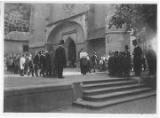 Abstract: Fotografia in bianco e nero con bordini bianchi. Merano. Piazza Duomo. Gruppo di persone davanti al portone d'ingresso della chiesa. Sul retro immagine, un'annotazione scritta a matita.