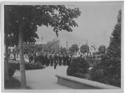 Abstract: Fotografia in bianco e nero con bordini bianchi. Merano. La banda cittadina di Bolzano presso il monumento di Andreas Hofer. Sul retro immagine, una nota a matita scritta a mano.