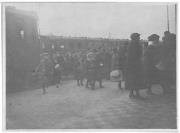 Abstract: Fotografia in bianco e nero con bordini bianchi. Merano. Stazione ferroviaria. Arrivo dei bambini viennesi a Merano per un periodo di riposo di tre mesi nonchè di sostentamento - aiuto nutrizionale.