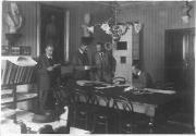 Abstract: Fotografia in bianco e nero con bordini bianchi. Merano. Il sindaco Gemaßmer (2. da dx) con i consiglieri locali Ernst Baumgartner e Josef Pritzi nonchè il banchiere e capo dell'Ufficio di Sussistenza Josef Prinnegg durante un importante incontro nella stanza del sindaco (vecchio municipio, edificio municipale).