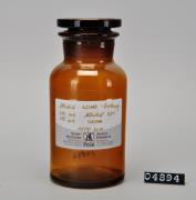 Abstract: Braune, runde Flasche, aus Glas, mit eingeschliffenem Hohlstopfen. Boden leicht eingewölbt, flache Schulter. Signiert: Alkohol - Wasser - Mischung. Etikett der Stadtapotheke Peer mit Klarsichtfolie überzogen. Datiert 15.4.2011. Beschriftet von Apothekerin Ingrid Deltedesco.