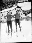 Abstract: Collezione di 92 lastre di vetro da Ciasa La Crepa del proprietario Complojer di Longega - Marebbe - Fotografia di due sciatori maschili in un prato innevato davanti a una casa.