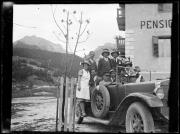 Abstract: Collezione di 92 lastre di vetro da Ciasa La Crepa del proprietario Complojer di Longega - Marebbe - Fotografia di otto uomini in abiti eleganti e cappelli con piume sulla testa e due donne con grembiule bianco. Sono tutti seduti/in piedi in una macchina davanti a una pensione a San Vigilio di Marebbe.