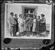 Abstract: Collezione di 92 lastre di vetro da Ciasa La Crepa del proprietario Complojer di Longega - Marebbe - Fotografia di una fotografia di due uomini in abbigliamento alpino con sei giovani donne in eleganti abiti quotidiani davanti ad una casa.