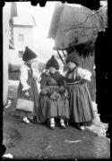 Abstract: Collezione di 92 lastre di vetro da Ciasa La Crepa del proprietario Complojer di Longega - Marebbe - Fotografia di tre donne in troht (costume tradizionale) con cappuccio di lana in inverno.