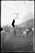 Abstract: Collezione di 92 lastre di vetro da Ciasa La Crepa del proprietario Complojer di Longega - Marebbe - Fotografia di tre persone con un puledro ed un altro cavallo in un prato. (probabilmente a Badia)