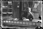 Abstract: Collezione di 92 lastre di vetro da Ciasa La Crepa del proprietario Complojer di Longega - Marebbe - Fotografia di un uomo giovane in giacca e cravatta. È seduto alla scrivania, riflettendo con una penna in mano.