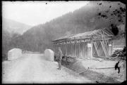 Abstract: Collezione di 92 lastre di vetro da Ciasa La Crepa del proprietario Complojer di Longega - Marebbe - Fotografia di un signore in uniforme da lavoro con berretto in piedi davanti a un ponte di cemento appena costruito mentre il vecchio ponte di legno ricoperto viene demolito accanto ad esso.