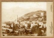 Abstract: Meran - Stadtansicht mit Sandplatz, Winterpromenade, Pfarrkirche, Steinach, Pulverturm und Küchelberg. Zu sehen ist im Vordergrund die Villa Fanny, im Mittelgrund u.a. das alte Hotel Erzherzog Johann, die Pension Putz (heute Seisenegg) und die Pension Hassfurther