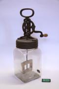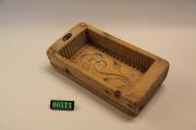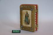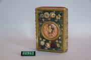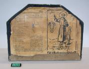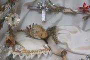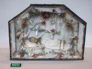 Glasschrein mit walmdachförmigem, oberen Abschluss aus 6 gläsernen Einzelelementen, einer Bodenplatte und der Rückseite aus fester Pappe. Die Glaselemente sind mit schwarzem Klebestreifen verbunden, deren Ränder mit filigranen Silberpapierstreifen überklebt sind. Die Rahmung der Schauseite ist zusätzlich mit gestanzten, hängenden Dreiecken mit Palmettenmuster aus Buntmetallblech verziert. Das Innere der Schatulle ist mit weißem Seidenstoff ausgekleidet, der Polster und das Kleid der wächsernen Christkindfigur ebenfalls mit den oben erwähnten Dreiecken verziert. Das schlafende Christkind trägt ein langärmeliges Seidenkleid und ist auf einer hügeligen Unterlage drapiert. Die filigrane Figur ist blondgelockt, der Kopf liegt auf einem Strahlenkranz. Über der Figur ist ein liegendes Kreuz aus Silberfiligran angebracht. Das Ensemble wird von Blumenranken aus Silberfiligran, Textil und Wachs umrahmt. Die Rückseite der Schatulle ist mit einer Doppelseite des St. Antoniusblattes, 15. Jahrgang, Heft 6, Jahr 1948 überklebt. Damit liefert das Zeitschriftenblatt einen guten terminus post quem für die Datierung der Klosterarbeit, die zeitnah nach Juni 1948 entstanden sein muss. Verwendung: Fatschenkindlein waren Gaben für Novizinnen auf dem Weg in ihr Klosterleben. Die Wachsfiguren werden auch „Seelentrösterlein“ genannt. In den italienischsprachigen Nachbargebieten des Unterlandes wurden solche Fatschenkindlein außerdem jungen Vermählten als Geschenk überreicht.