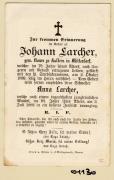 Abstract: Sterbebild von Johann Larcher, gew. Bauer in Kaltern in Mitterdorf Gest. am 02.10.1889 im Alter von 79 Jahren ohne Foto Sterbebild von Anna Larcher Gest. am 03.07.1888 im Alter von 89 Jahren ohne Foto