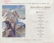 Abstract: Speisekarte, 'XXVIII. Generalversammlung des Deutschen u. Österreichischen Alpenvereins in Meran. Karte zum Festmahl im Kurhaus mit Farbdruck auf der VS : Hohe Weiße u. Lodnerhütte (Lodner Hütte, Texelgruppe)