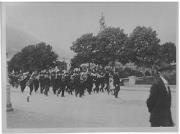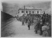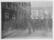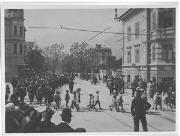 Abstract: Fotografia in bianco e nero con bordini bianchi. Merano. Corso Libertà, incrocio via delle Corse. Lavoratori in corteo sul Corso Libertà il 1. maggio 1920.
