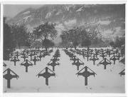 Abstract: Fotografia in bianco e nero con bordini bianchi. Cimitero di Merano. Nel giorno di Ognissanti del 1919, la neve alta, ricopre il cimitero militare.