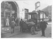 Abstract: Fotografia in bianco e nero con bordini bianchi. Merano. Maia Bassa. Via Roma. Il veicolo postale per la Passiria davanti all'ufficio postale e telegrafico. Sul lato dx dell'immagine, il dipendente post. Josef Wackernell. Sul retro-immagine una breve nota scritta a mano.