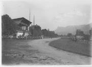 Abstract: Fotografia in bianco e nero con bordini bianchi. Merano. Via Andreas Hofer / n. spec. via Otto Huber. La caserma dei Landesschützen (=fucilieri regionali) utizz. come ospedale militare (K.u.k. Osp. di riserva, I Divisione/Dip.).