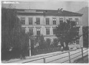 Abstract: Fotografia in bianco e nero con bordini bianchi. Merano. Jahnstraße, odierna via Galilei. La scuola municipale maschile spec. "Volks - und Bürgerschule" (=Popolare - e scuola municipale/cittadina) adibita, durante il periodo bellico, ad ospedale di riserva - ospedale militare.