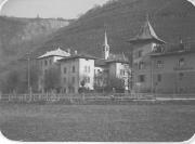 Abstract: Fotografia in bianco e nero con bordino bianco. Merano. Untermberg-Straße, odierna via Verdi. Il complesso di edifici delle Kreuzschwestern (Suore di S. Croce)(Marienherberge) con la casa delle fanciulle, adibita, durante il periodo bellico, ad ospedale di riserva - ospedale militare.