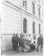 Abstract: Fotografia in bianco e nero con bordini bianchi. Merano. Feriti o malati di fronte all'ospedale di riserva (osp. mil.) del k.u.k. Landesschützenkaserne/Caserma dei fucilieri reg. In foto anche il prigioniero di guerra russo Salomon Albert. Sul retro immagine, una nota scritta a mano.