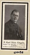 Abstract: Sterbebild von P. Karl Alois Gögele, Dechant und Pfarrvikar in St. Leonhard in Passeier Geb. am 09.03.1879 in Lana, gest. am 15.02.1939 mit Foto