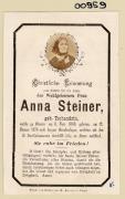 Abstract: Sterbebild von Anna Steiner geb. Tschandrin Geb. am 08.06.1808 in Tramin, gest. am 12.01.1876 in Tramin mit Foto