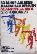 Abstract: manifesto per i 50 anni della gara di sci a 'Kandahar' a S. Antonio del Tirolo. Motivo: sciatori stilizzati in vari colori, del 1977
