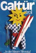 Abstract: manifesto pubblicitario di Galtür in Tirolo. Motivo: omino di stoffa con gli sci e il viso a forma di sole del 1970