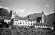 Abstract: "Blick vom Turm des Klosters auf die Kuppel der Klosterkirche" Bozen, Gries, Kloster Muri Gries, Kuppel, Fenster mit Bogenabschluß, Blick auf die Häuser (Villen) von Gries.