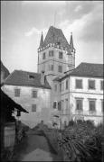 Abstract: Bozen, Gries, Kloster Muri Gries, Gebäudefront mit Fenstern, zwei Türme, links Teilansicht der Stiftskirche.