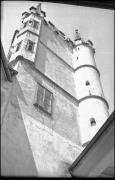 Abstract: Bozen, Gries, Kloster Muri Gries, Turm. Fassade der Stiftskirche, Säulen, Fenster mit Bogenabschluß, davor Personen