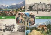 Abstract: 150 Jahre Kurstadt bzw. Kurort Meran. Jubiläumskarte mit fünf historischen Motiven: Stadtansicht gegen Westen, Stadttheater, Laubengasse, Theaterplatz und Promenade mit Kurhaus